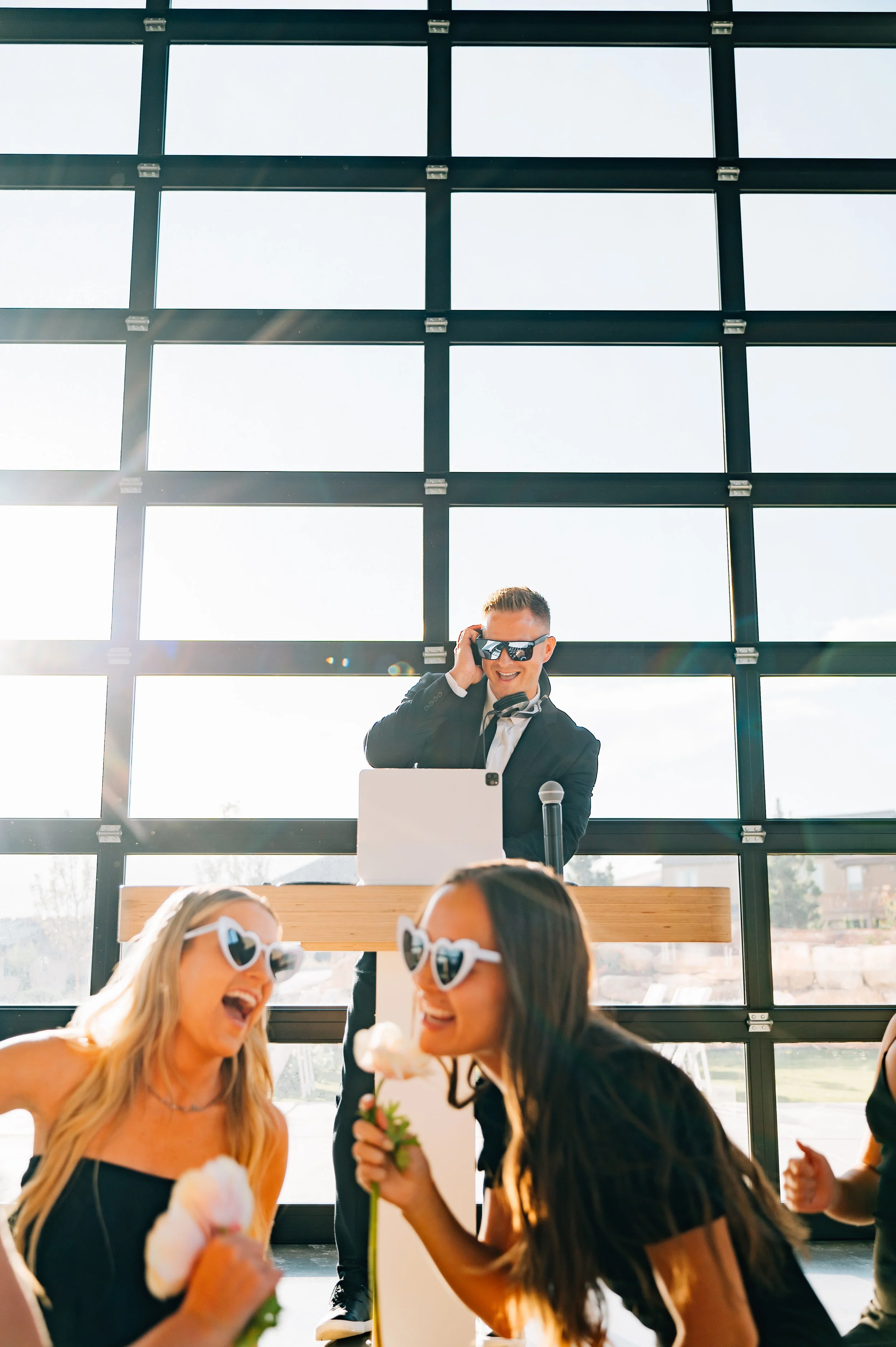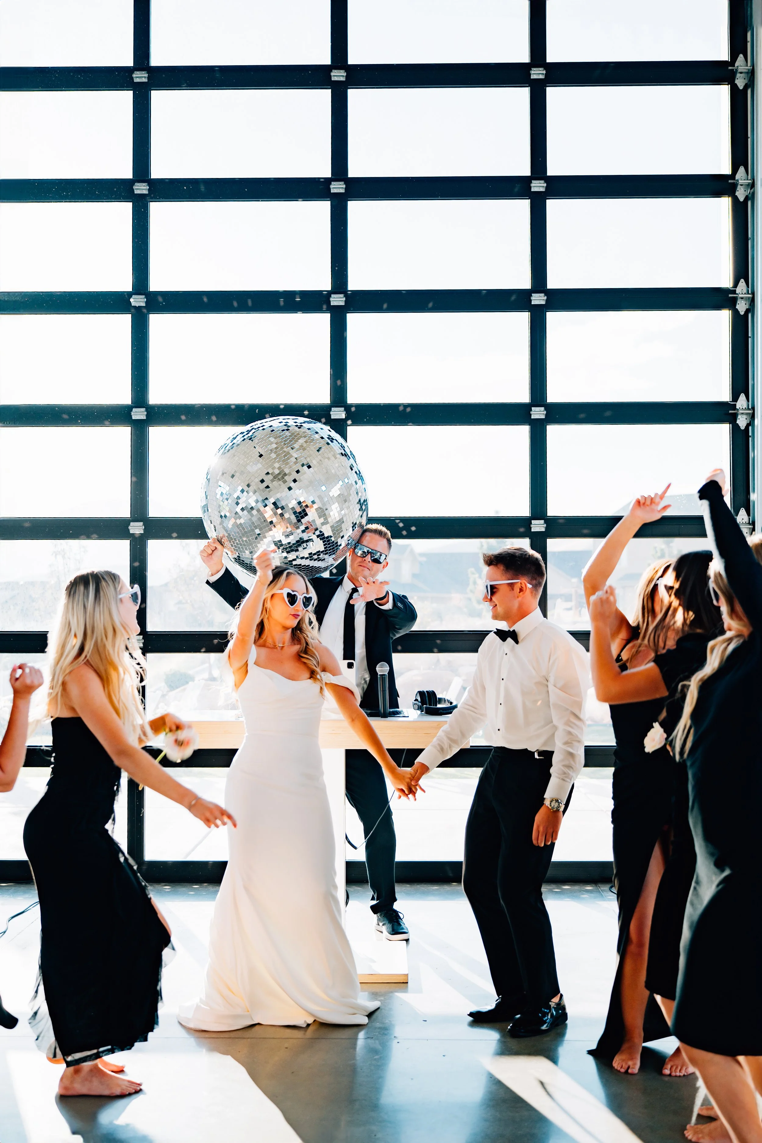 Fog or low-lying clouds create that cinematic moment for your first dance, a mirror ball refracts light across the room, and a sleek digital photo booth captures the fun.